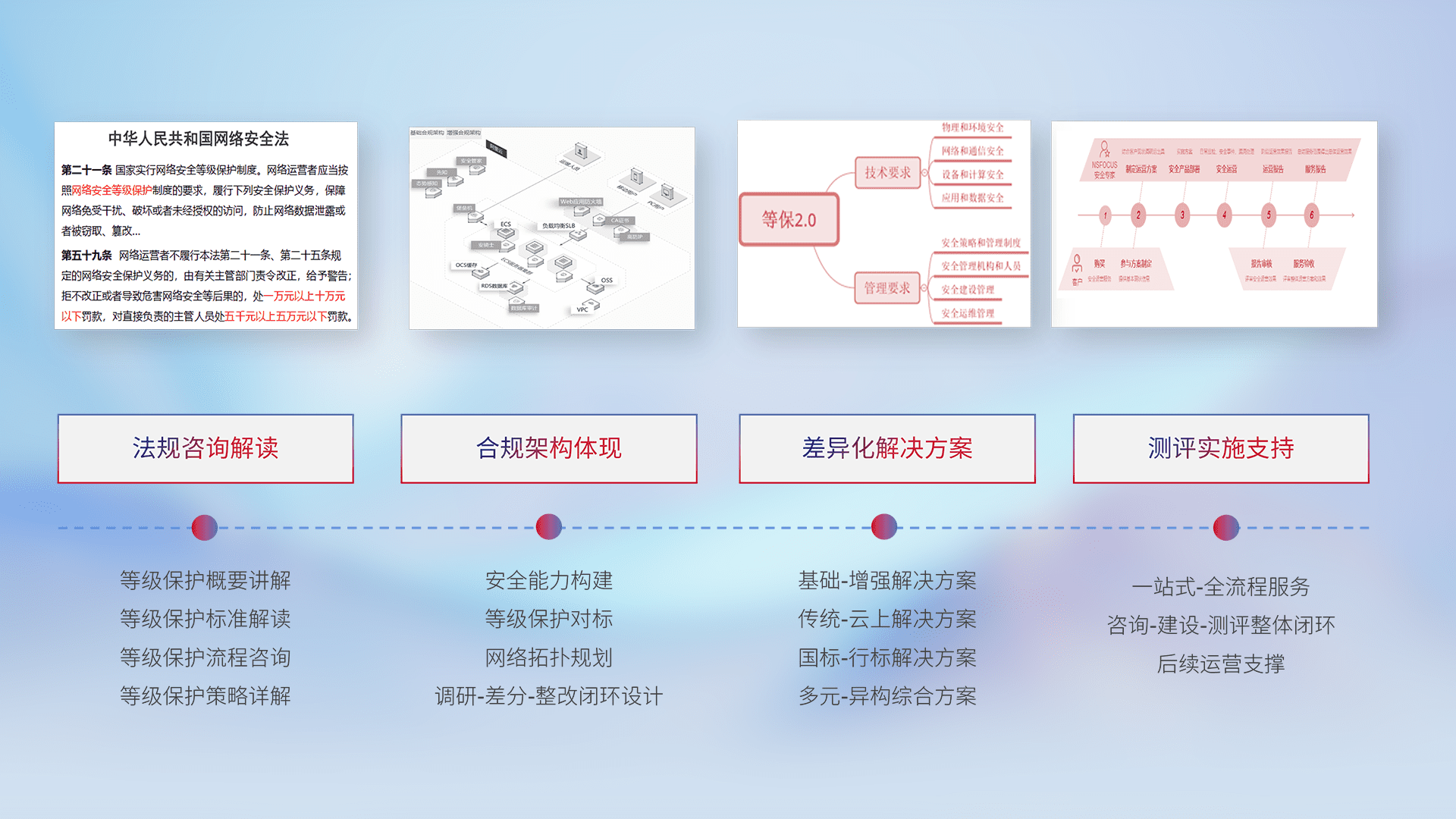 通过专业的法律咨询解读、、、合规架构体现、、、差异化解决方案、、、、测试实施支持等服务,,,为客户量身打造等保合规体系。。。。